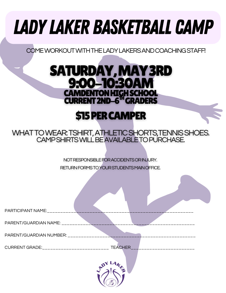 Lady Laker Basketball Camp is approaching! When? Saturday, May 3rd, 9:00-10:30 AMWhere? Camdenton High School Who? Current 2nd-6th GradersCost? $15 per CamperT-shirts will be available for purchase...